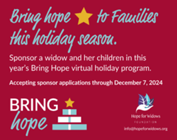 As we approach the holidays, the Hope for Widows Foundation is seeking sponsors for our annual Bring Hope Holiday Program. This initiative supports widows facing financial challenges, helping them provide gifts and essentials for their children during this special time of year.
